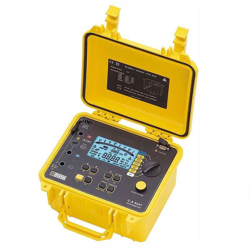 CA6547 5kV絕緣電阻測試儀,可設置自動測量,並自動計算和顯示DAR、PI、DD等測量指標。在測量過程中,可切換顯示測試電壓、絕緣電阻以及漏電流;測量結束後,可切換顯示被測物的電容及放電電壓。CA6547採用高規格安全理念設計,可經由內部充電電池,或外部AC電源輸入進行測量操作。儀器配備RS-232通訊介面,可通過PC對其進行組態或運行操作;另可使用DataView®分析軟體(選購),將測量結果自動生成報表,並通過印表機列印輸出。