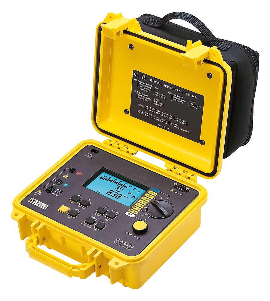CA6543為全自動、1000V、可測絕緣電阻達4TΩ的電子式絕緣電阻測試儀,其同時可測量電壓、電容,並自動計算DAR及PI值。