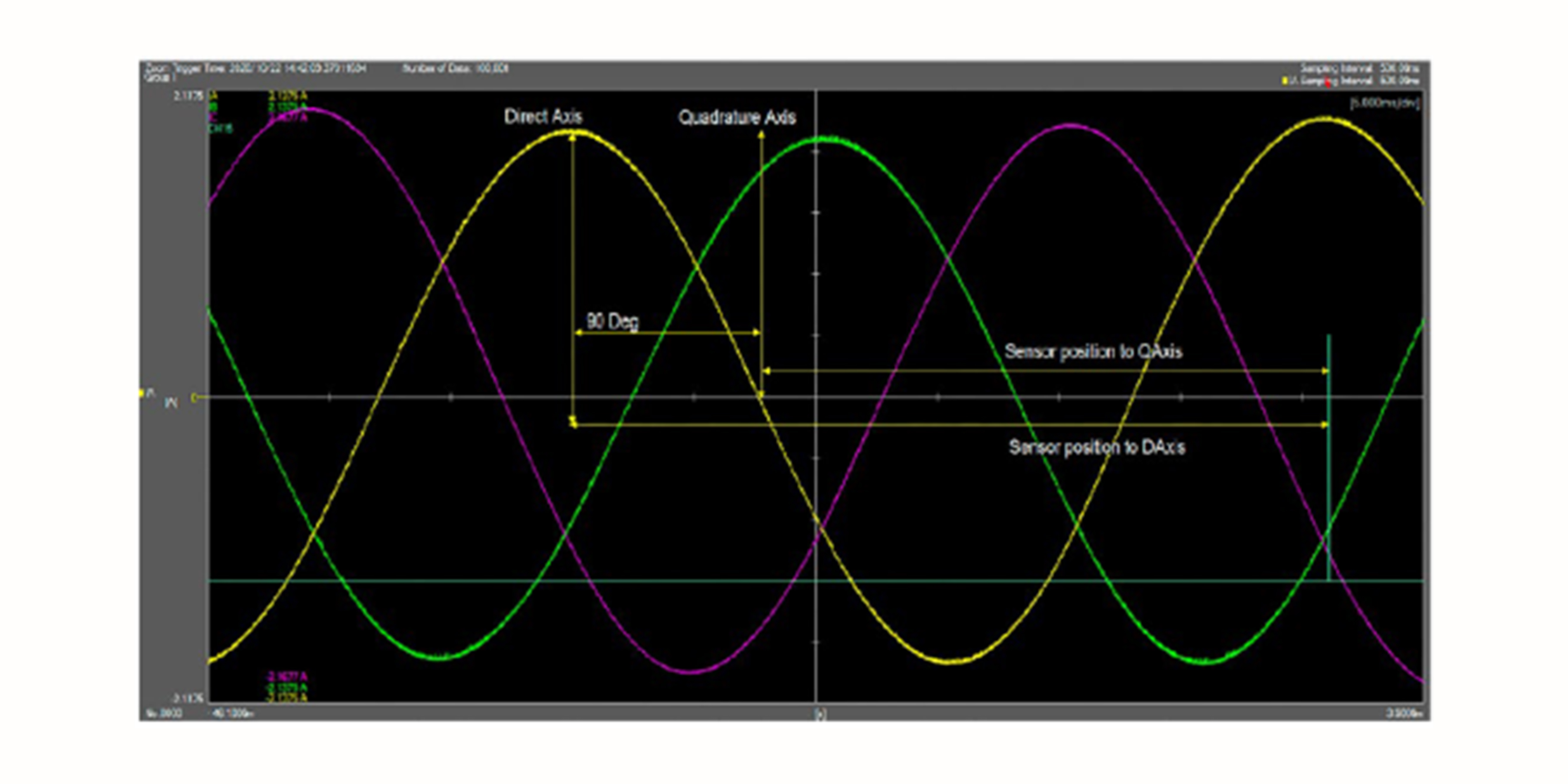 為了了解定子電流 (Is) 的相對角度位置並計算 Id 和 Iq 分量,需要測量轉子軸的位置。此位置的精度取決於感測器本身相對於轉子軸(直軸)的安裝方式。理想情況下,感測器位置直接參考直軸或交軸。然而,在測試情況下手動安裝感測器可能不可行,因此必須在 Id 和 Iq 計算中進行補償。